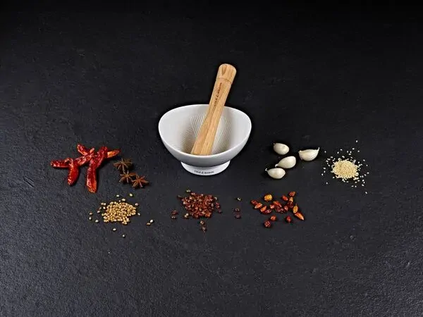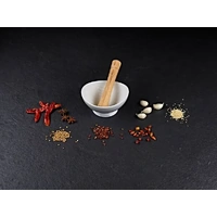 Mortar is made from white porcelain with exterior glaze. It features raised edges for easy holding and flared base for stability.