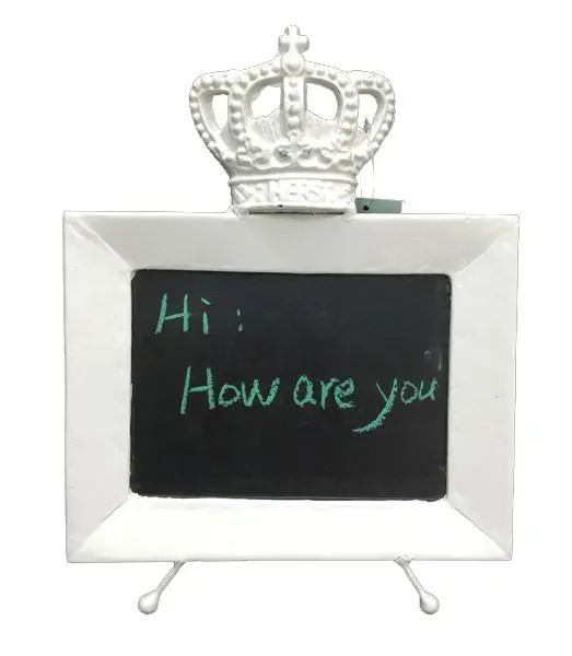 Each chalkboard is made of metal and is sized at 22cm x 15cm. It stands on two small legs and has a white border with a classic black chalkboard inner section. On top of the board is an ornate royal crown with a detailed design.