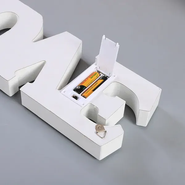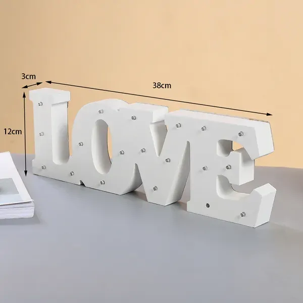 The LOVE sign is free standing and can be mounted on a wall or placed on a flat surface. It measures 38cm long by 12cm high and runs off batteries which are included with the sign. Simply open the back, slip in the batteries and you are powered up and ready to go. The LED lights glow with bright white light and make the sign sparkle.